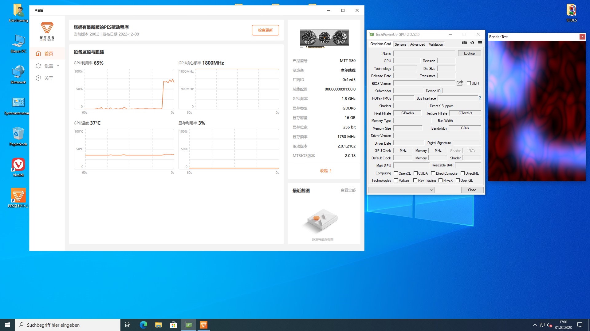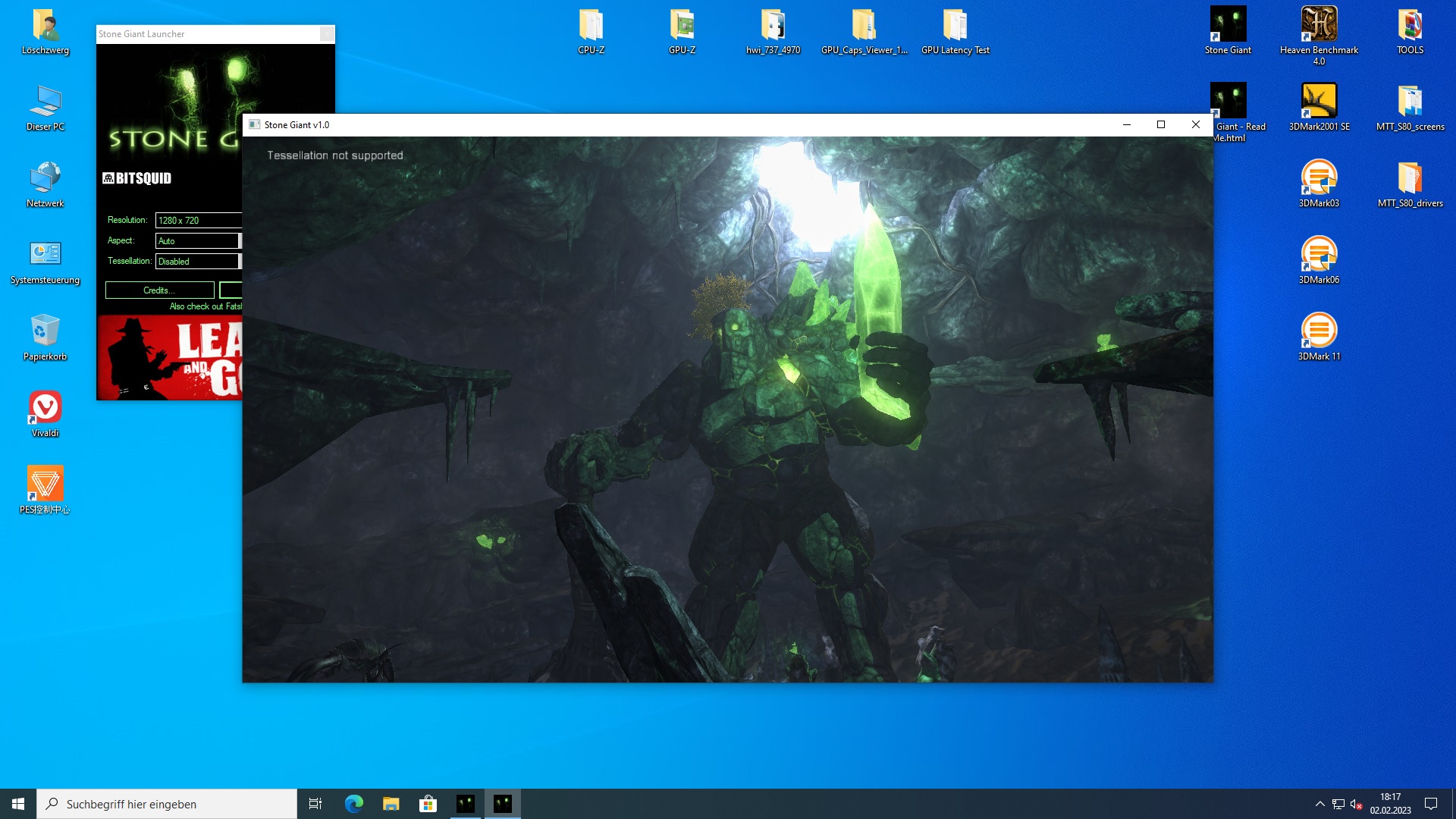 -> Der GPU-Z Render-Test läuft und das PES Control Center zeigt entsprechend Auslastung anZwar wird DX11 im FL 11_1 unterstützt, die Karte beherrscht aber kein Tessellation. Unigine Heaven, 3DMark11, FFXIV Endwalker, Stone Giant... alles stürzt ab sobald Tessellation aktiv oder nicht abwählbar ist. Stone Giant meldet auch "Tessellation not supported" wenn man es im Test aktivieren möchte.