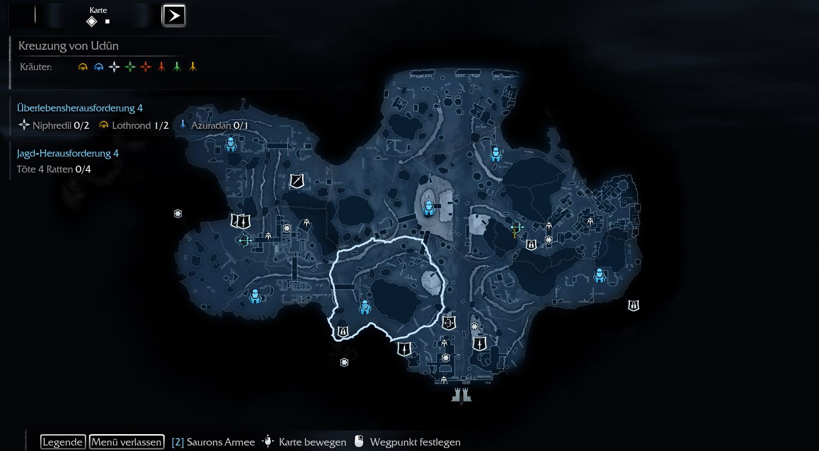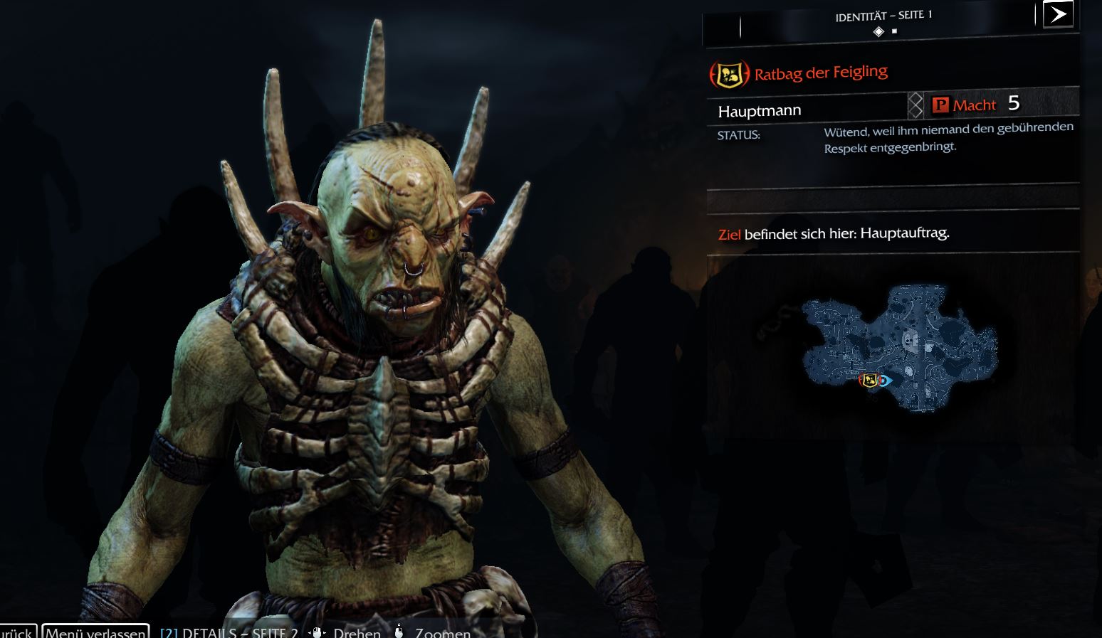 Ich habe aktuell alle Neben-Hauptmänner in der 1. Reihe eliminiert. Deren Aufenthaltsorte waren leicht zu finden, da sie ja 1. durch die in Grün erscheinende Region auf der Karte eingegrenzt und durch die Geist-Ansicht in Rot dargestellt werden. Jedoch gestaltet sich das mit dem Abarbeiten der Story sehr schwierig. Z.B. bei Ratbag.....dieser befindet sich laut Karte an der Kreuzung von Udun. Es wird aber weder die Region grün hervorgehoben noch erscheint er auf der Mini-Karte als Totenkopf-Symbol mit rotem Rand, nachdem ich ihn als Ziel markiert habe. Ich habe schon etliche Minuten damit verbracht, mir die Region als Geist anzusehen um ihn als rote Figur ausfindig zu machen. Leider ohne Erfolg.