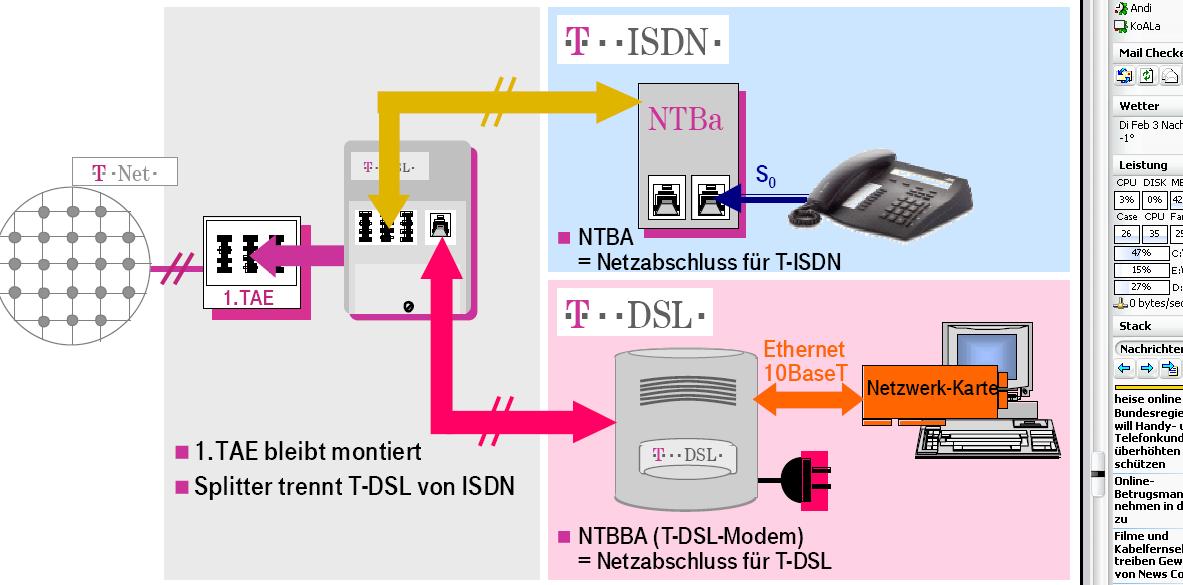 Als letztes habe ich nicht wirklich nen Plan, wie ich den T-DSL Splitter der Telekom anbringen soll? Gibts da irgendwie ne Anleitung (dabei war ma keine!)? Wie gesagt: Wir haben schon einen ISDN Anschluss in der Garage und darauf muss dann der SPlitter...