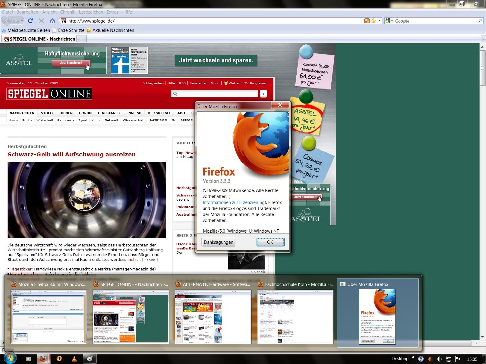 @sunrise: Wenn du 5 Tabs offen hast, werden in der Taskleiste beim drüberfahren niemals 5 Vorschaufensterchen für die Tabs angezeigt, sondern genau einer und zwar der des aktiven Tabs. Ansonsten mach Screenshot von FF Version und dem genannten Verhalten