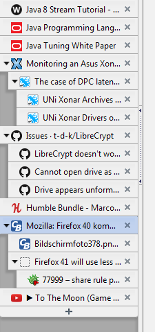 -Auflistung von den Tabs am linken Rand, vieleicht gibt es ein Addon wo z.B. am Rand immer nur das Tab-Icon angezeigt wird und wenn man mit der Maus drüberfährt auch noch der Tab-Text angezeigt wird? => TreeStyleTab, kann das ungefähr, zumindest gibt es eine Option die Tableiste links nur ganz schmal anzuzeigen und zu vergrößern wenn man drüberfährt.