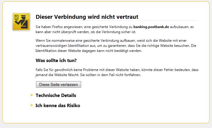 Nachrichten über nicht vetrauenswürdige Verbindungen kommen gerne mal, wenn die Systemzeit falsch eingestellt ist, sodass das Zertifikat des Servers angeblich schon ungültig bzw. noch nicht gültig ist (was steht in den "Technischen Details" in der Warnmeldung im Firefox?).