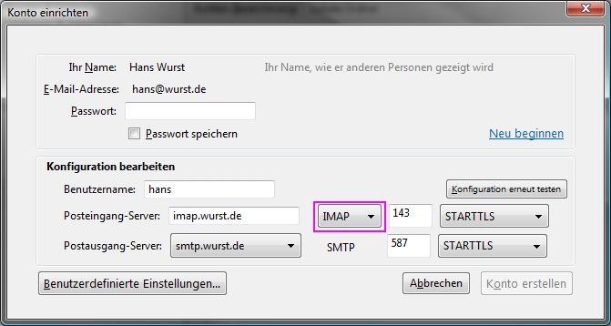 Ein Klick im Assistenten auf "Benutzerdefinierte Einstellungen", was einem eine vollständig manuelle Einrichtung des Kontos erwarten lässt, enttäuscht. Der Servertyp lässt sich nicht auswählen. Auch später in den Servereinstellungen nicht.