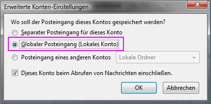 Button "Erweitert" klicken und "Globaler Posteingang (Lokales Konto)" auswählen, alles bestätigen