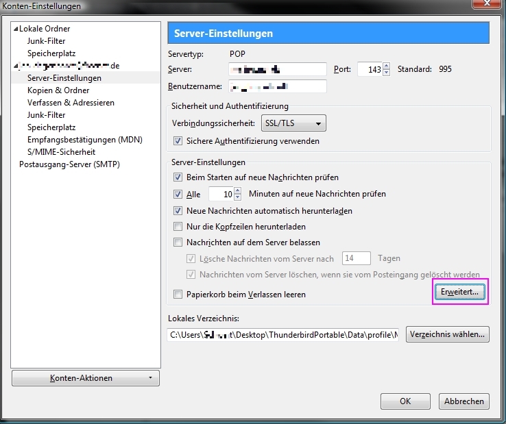 Restliche Einstellungen tätigen, ggf. Server korrigieren, Verschlüsselung ändern usw.