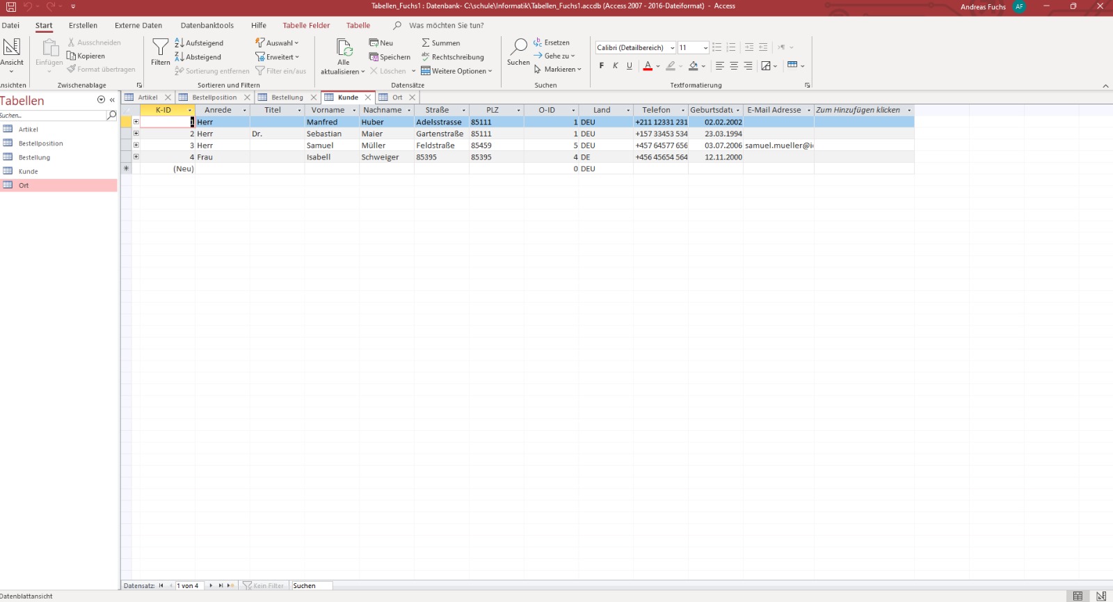 - Implementierung in Access (Tabellen anlegen und anpassen, Beziehungen erstellen, referentielle Integrität)