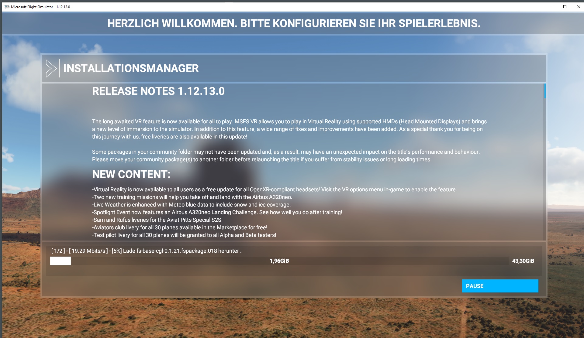 Aktuell sind immer noch 43,3 GB runterzuladen. Sowas frustriert total und hat mit Spielspaß und Benutzerfreundlichkeit rein gar nichts mehr zu tun. Ich will fliegen und nicht tagelang downloaden! Wahrscheinlich werde ich noch bis Anfang nächster Woche herunterladen, bis das Spiel dann endlich mal installiert ist. Zudem wird in dieser Zeit mein Computer blockiert! Es ist einfach nur ein Albtraum.