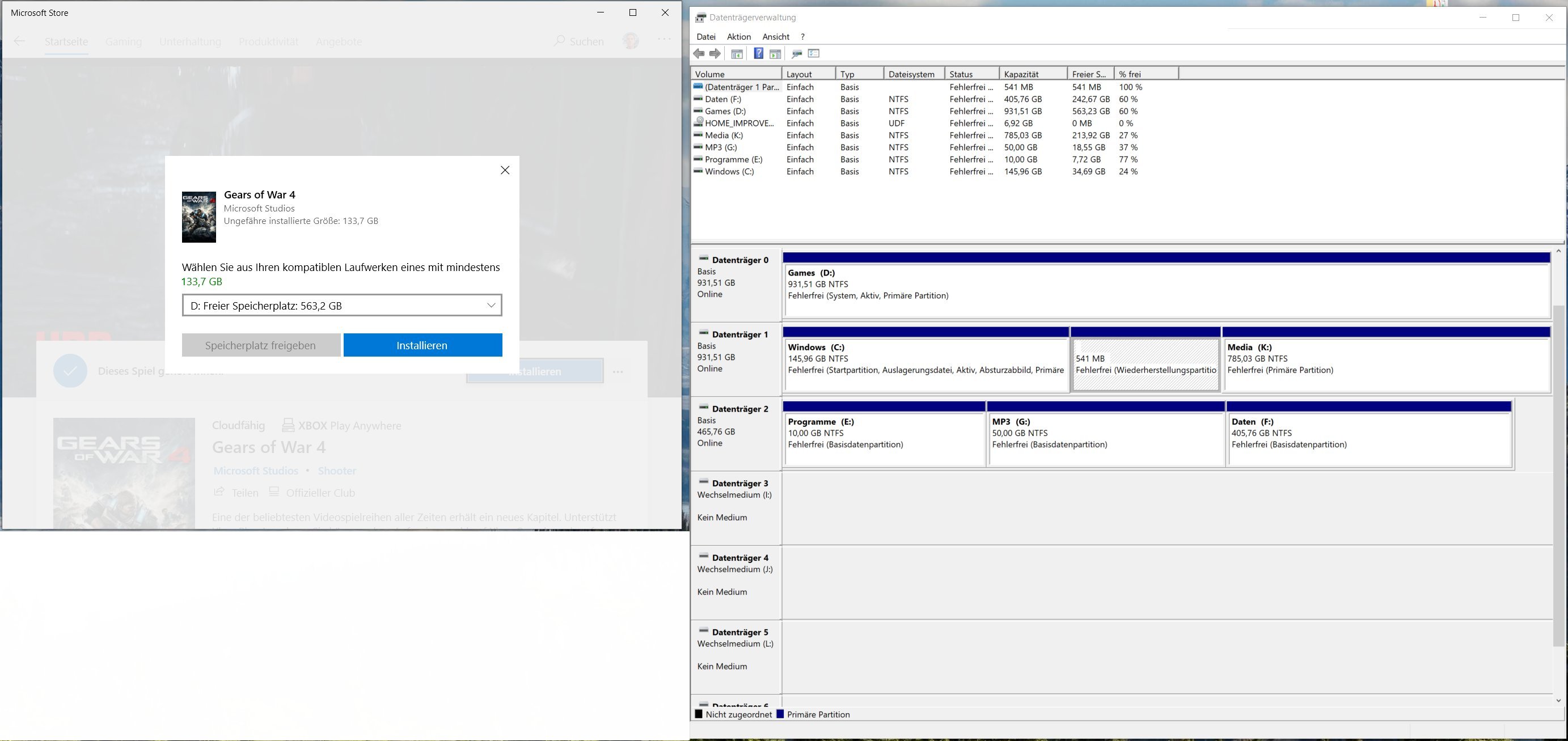 Wenn ich im MS Store ein Spiel installieren möchte, wird mir die Platte auch mit ausreichend Speicher angezeigt. Wenn ich aber auf Installieren klicke, passiert einfach nichts.