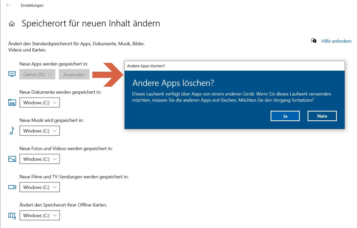 Bei Google habe ich gefunden, dass man den Speicherort für "Apps" in den Systemeinstellungen ändern kann. Wenn ich versuche von C:\ auf D:\ zu wechseln wird mir aber angezeigt, dass irgendwelche anderen Apps gelöscht werden müssten!? Da bin ich aber sowieso nicht sicher, ob das mein Problem lösen würde.