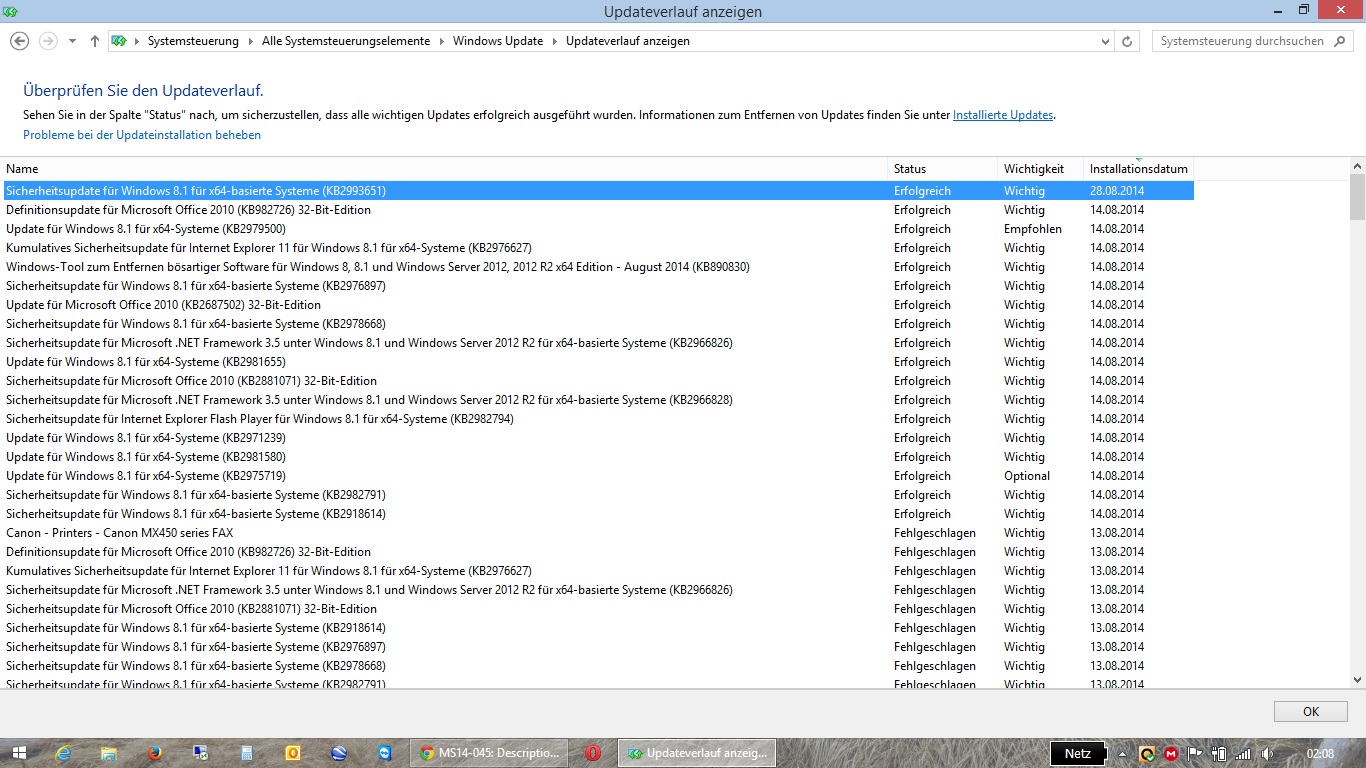 Desktop Lenovo (h520s, Win8 64bit) lief, hat sich bei installieren und neustarten selbst übertroffen und hat 5 Sekunden zum Hochfahren gebraucht^^, irgendwie ist der seit dem letzten Patchday sowieso ein verdammt fixer mit hochfahren, davor mit seiner SSD schon schnell und jetzt noch schneller (beim Win8 Start und beim Neustart)
