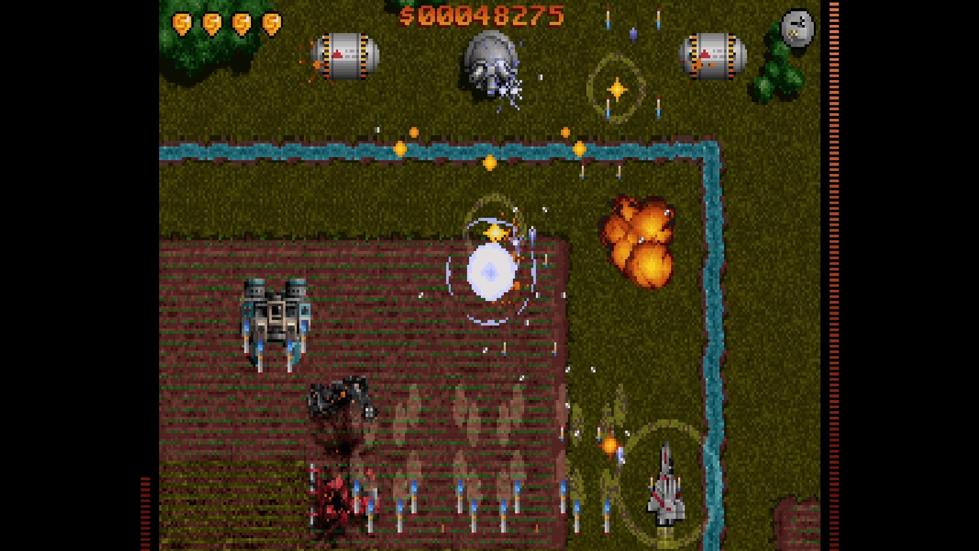 Obwohl das Waffenarsenal zu diesem Zeitpunkt mit dem Doppel-MG, einem Missile Pod, einem Plasmagewehr sowie einer Auto Tracking-Minigun, die verschiedene Luft- und Bodenziele gleichzeitig anvisieren kann, bereits sehr proper ausgestattet ist, merkt man anhand der auf dem Bildschirm herrschenden Action schnell, dass man hier sehr auf Zack sein muss. Die komplette Episode 1 mit allen 9 Levels gibt es seit 1994 (und auch heute noch) übrigens gratis als Shareware - so bin auch ich damals mit Hilfe des 486 DX50 meines Vaters auf dieses Spiel aufmerksam geworden.
