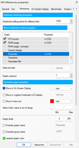 Ich möchte mit MSI Afterburner neben anderen Werten auch meine in Game Framerate als Graph aufzeichnen lassen, aber es gibt schlichtweg keine Framerate Option zum Auswählen bei mir in der Liste der Überwachung/Monitoring Werte.....?!