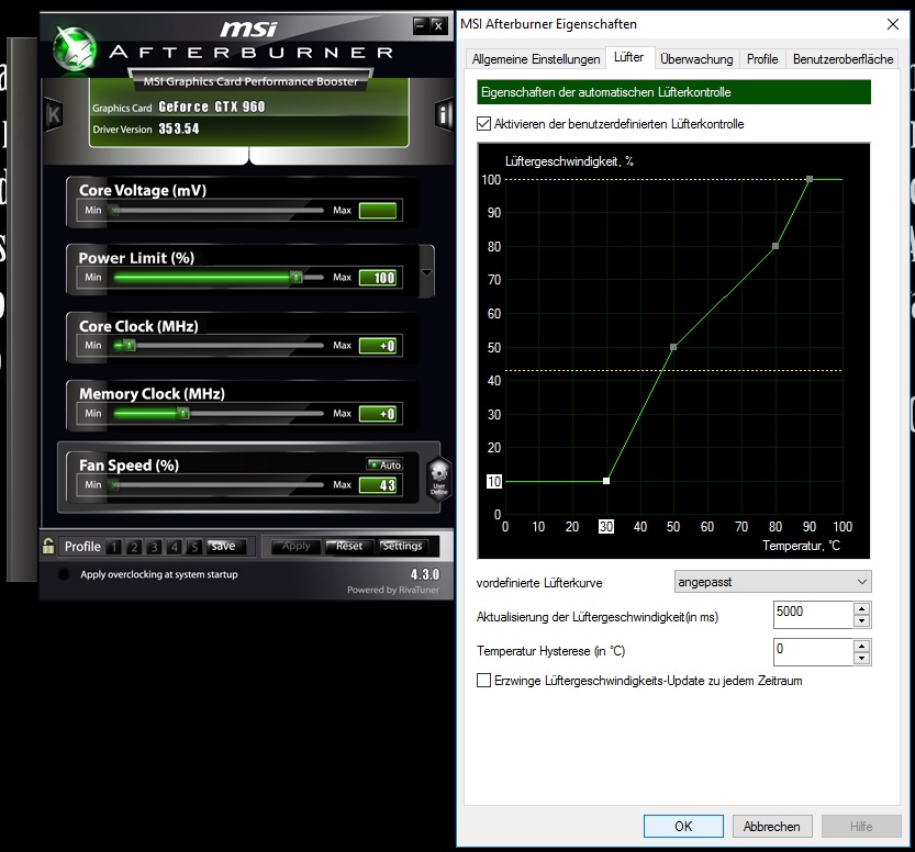 Wenn ich über MSI Afterburner eine Lüfterkurve einstelle, tritt diese nicht in Kraft. Ich kann die Lüfter im Hauptmenü auch nicht unter 43 stellen. Woran kann das liegen?
