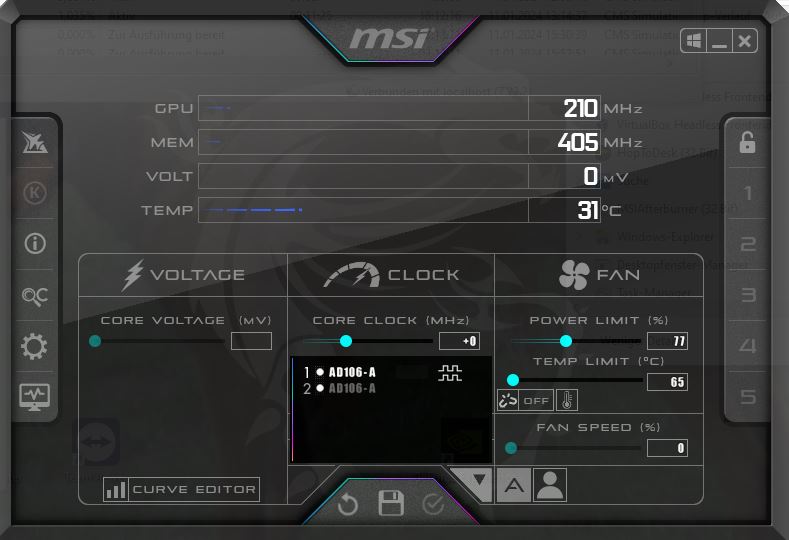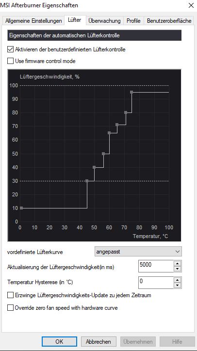 Wenn ich unter Einstellungen > Lüfter > bei "Aktivieren der benutzerdefinierten Lüfterkontrolle" ein Häkchen setze, in der darunter liegenden Matrix die Kurve für Temperatur / Lüftergeschwindigkeit definiere und dies dann mit "übernehmen" und "OK" quittiere (mit "vordefinierte Lüfterkure: angepaßt"), wird diese Kurve im Afterburner Bedienfeld, rechts unten bei Fanspeed-Einstellung auf automatisch, NICHT automatisch übernommen; d.h. es zeigt sich bei Fanspeed, abhängig von der GPU Temperatur, ein ganz anderer Wert als vorher in der Matrix vorgegeben.