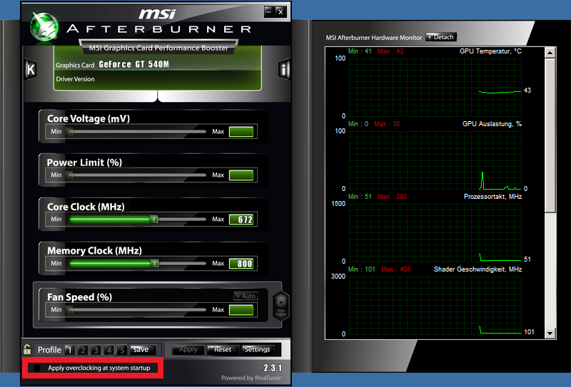 Beim Afterburner unten links kann man auswählen, ob beim Windows Start das OC übernommen werden soll oder nicht.