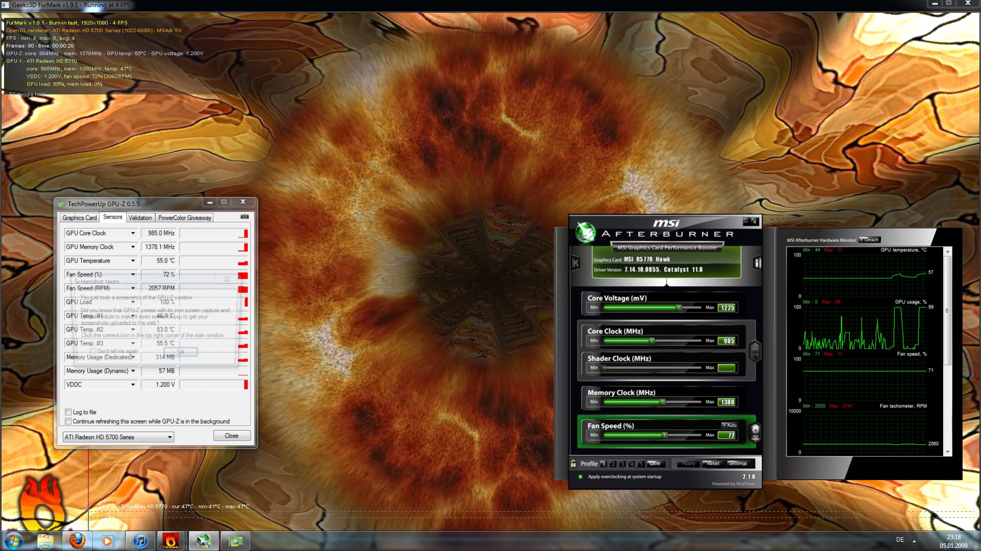 Ich habe schon vor Monaten mal probiert meine MSI R5770 richtig zu Oc´en nur leider ging da nicht viel 985/1380, auch mir Vcore erhöhung.