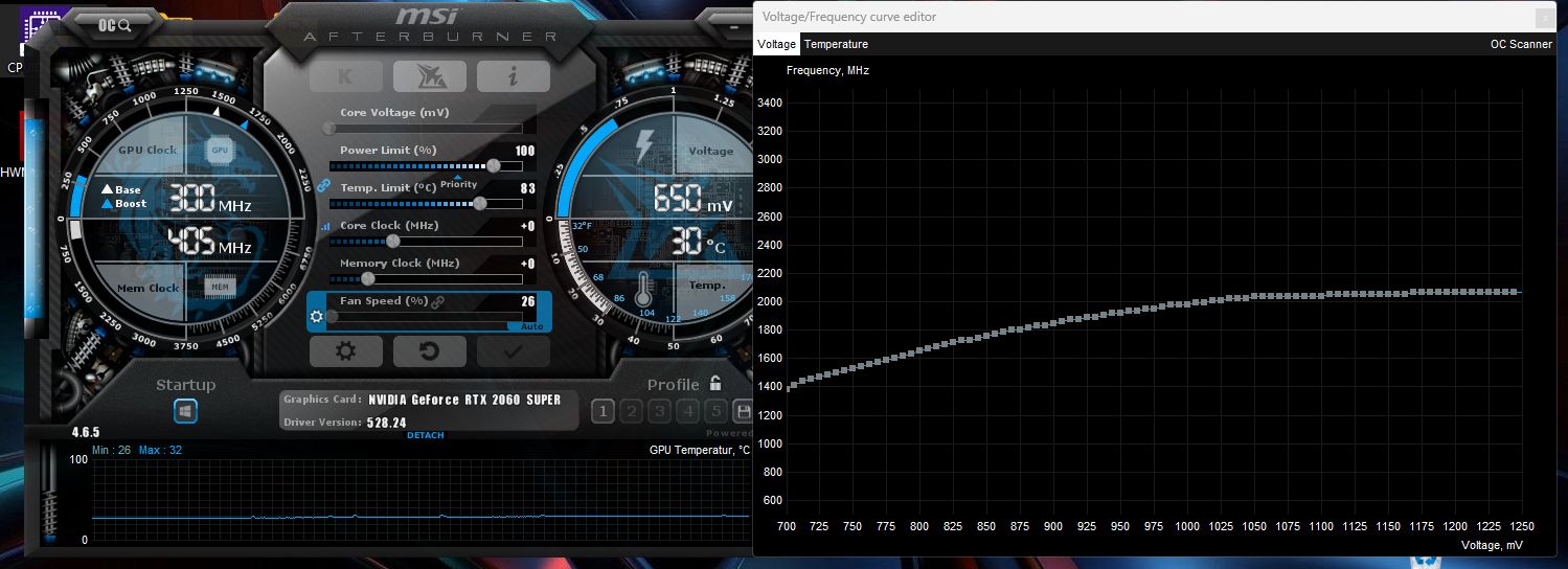 in den MSI Afterburner-Einstellungen gibt es die Mögleichkeit, ein Häckchen bei "Spannungsregelung freizuschalten" - siehe Screenshot - rechte Seite. Man würde also annehmen, daß daraufhin (nachdem der Afterburner, wie verlangt, neu gestartet wurde) man im Tool selbst - siehe linke Seite im Screenshot - die Core Voltage verändern kann. Ist aber nicht der Fall - der grüne Regler bleibt matt-grün anstatt hellgrün.
