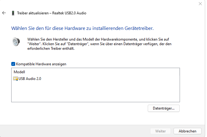 Im Geräte Manager wird mir nach dem aktualisieren des empfohlenen ONBOARD AUDIO TREIBERS für den "Realtek HD Universal Driver" das hier "USB Audio 2.0" angezeigt, obwohl dort nun "HIGH DEFINITION AUDIO TREIBER" stehen müsste.
