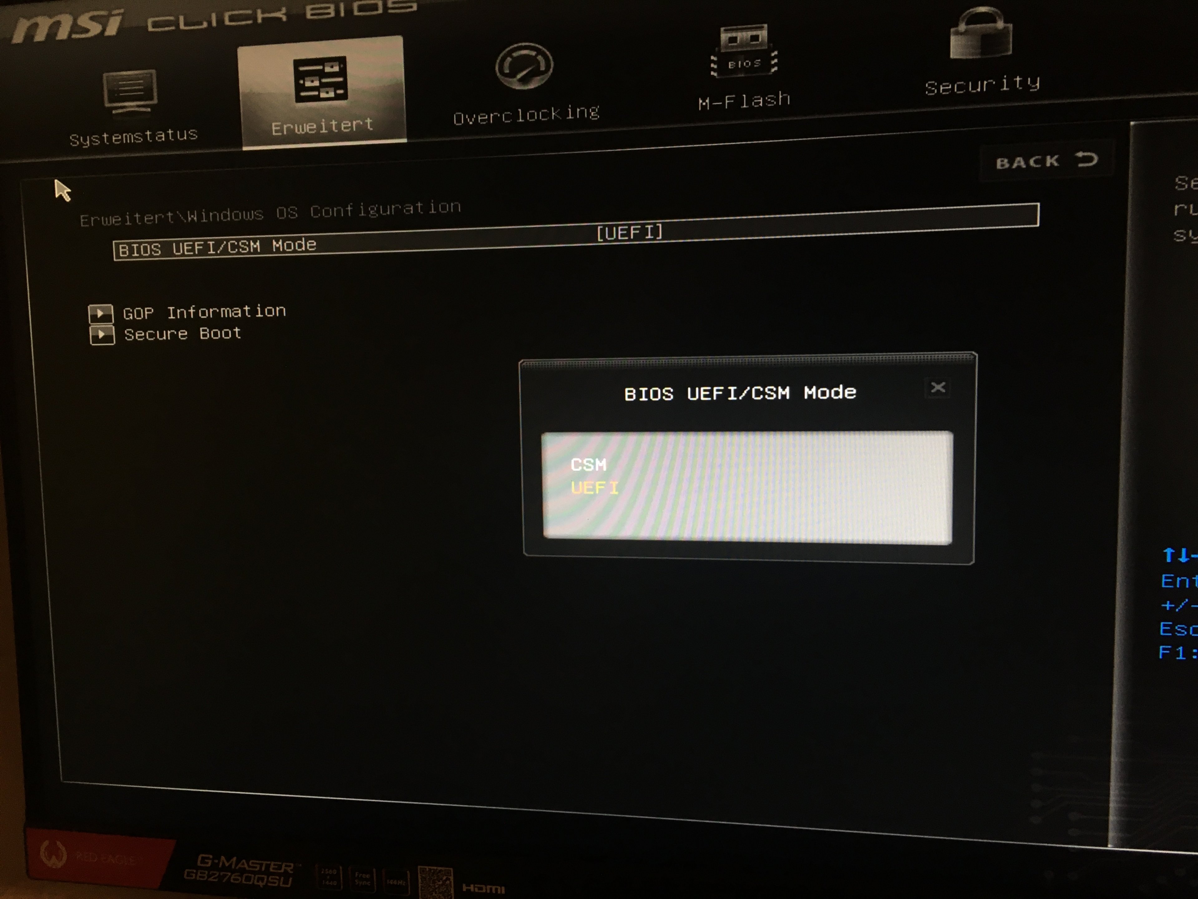 Hier noch ein Bild zu aktiviertem GOP bei deaktiviertem Fastboot. GOP ist aktiv, sobald Windows 10 WHQL Support aktiviert wurde.