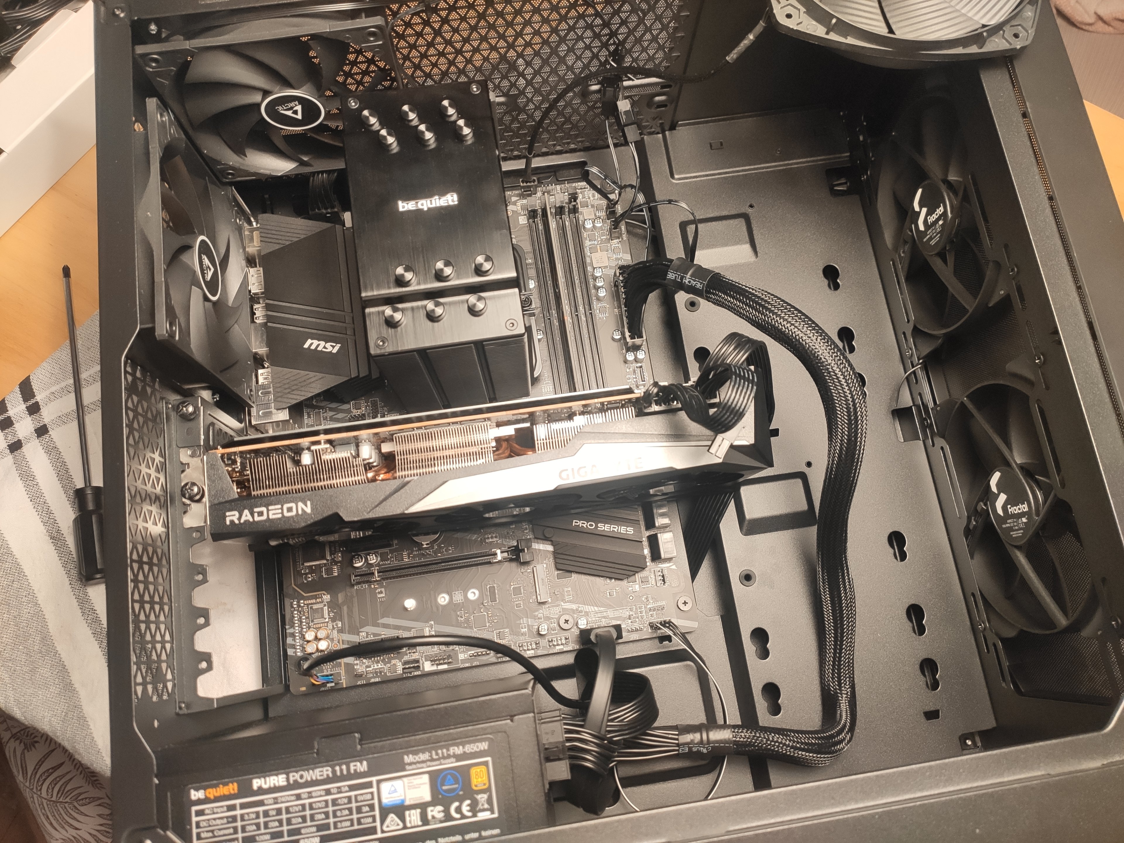 habe mir oben genannten Build neu zusammengeschraubt. Wenn ich booten will, spingt das Netzteil an und die Debug LEDs zeigen erst ca 3-5 Sekunden CPU an, dann geht diese wieder aus und VGA leuchtet dauerhaft weiter. Ansonsten passiert nichts. RGB auf der GPU gehen nicht an, auch keiner der drei GPU-Lüfter. CPU-Kühler springt nicht an, auch sonst keine Gehäuse-Lüftung. Verkabelung schicke ich euch mal als Bild.