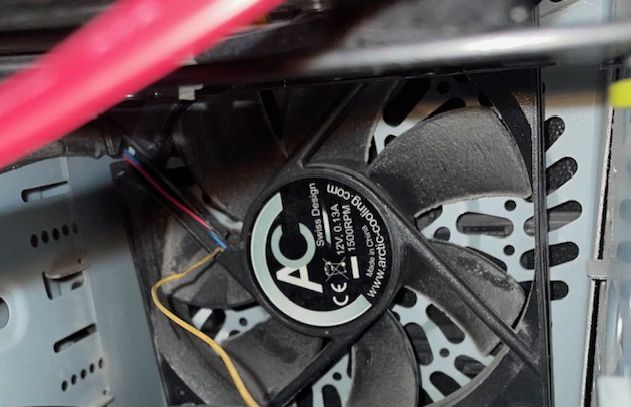 Die beiden vorderen Gehäuselüfter, Beschriftung sagt Arctic Cooling 12V 0.13A 1500RPM, zucken jedoch nur ab und an, rotieren aber nicht. Sie haben beide einen 4poligen Anschluss und hängen an SYSFAN1/3. Von ihnen geht noch ein gelbes Kabel hab, vermutlich der Lüfterimpuls ?