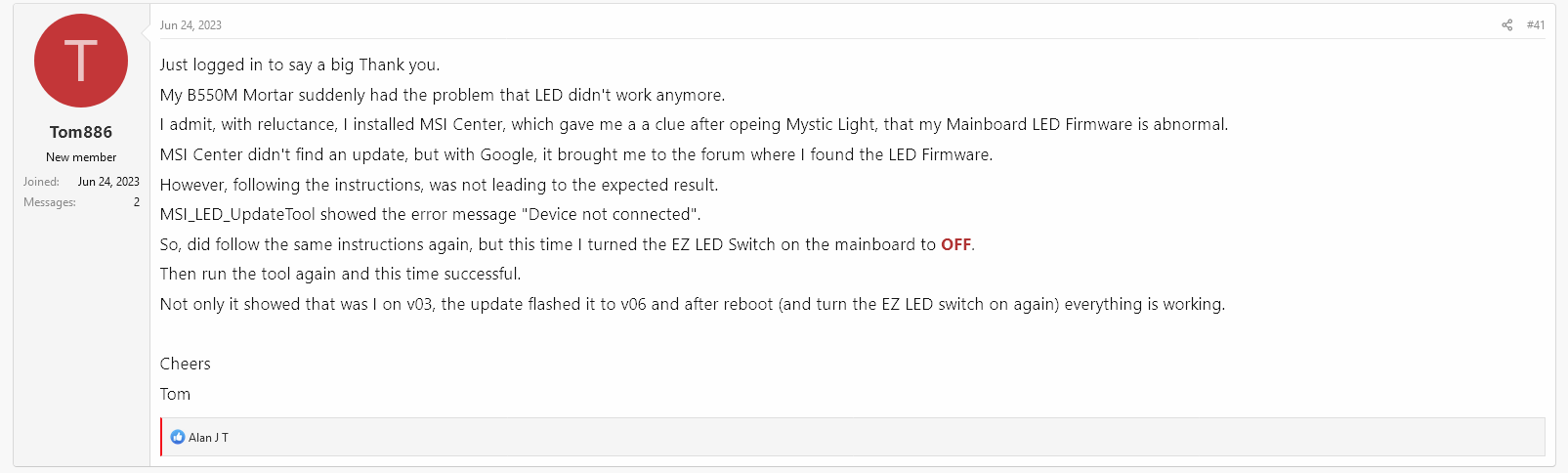 Auf der MSI Seite gibt es eine Anleitung wie man das Problem angeblich lösen kann -->Mittels Firmware Upgrade des RGB Controllers. Leider funktioniert das auch nicht. Auf dieser Seite habe ich gelesen das wenn man einmal die Version 00 im System hat es unmöglich ist ein Upgrade durchzuführen --> https://forum-en.msi.com/index.php?threads/led-firmware-is-abnormal.372427/page-2#post-2186493