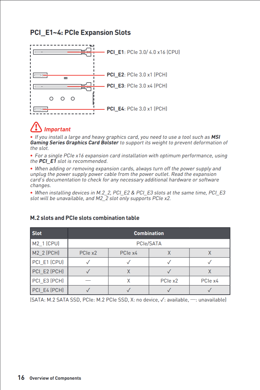 ** When installing devices in M.2_2, PCI_E2 & PCI_E3 slots at the same time, PCI_E3 slot will be unavailable, and M2_2 slot only supports PCIe x2. Please refer to page 16 for details.