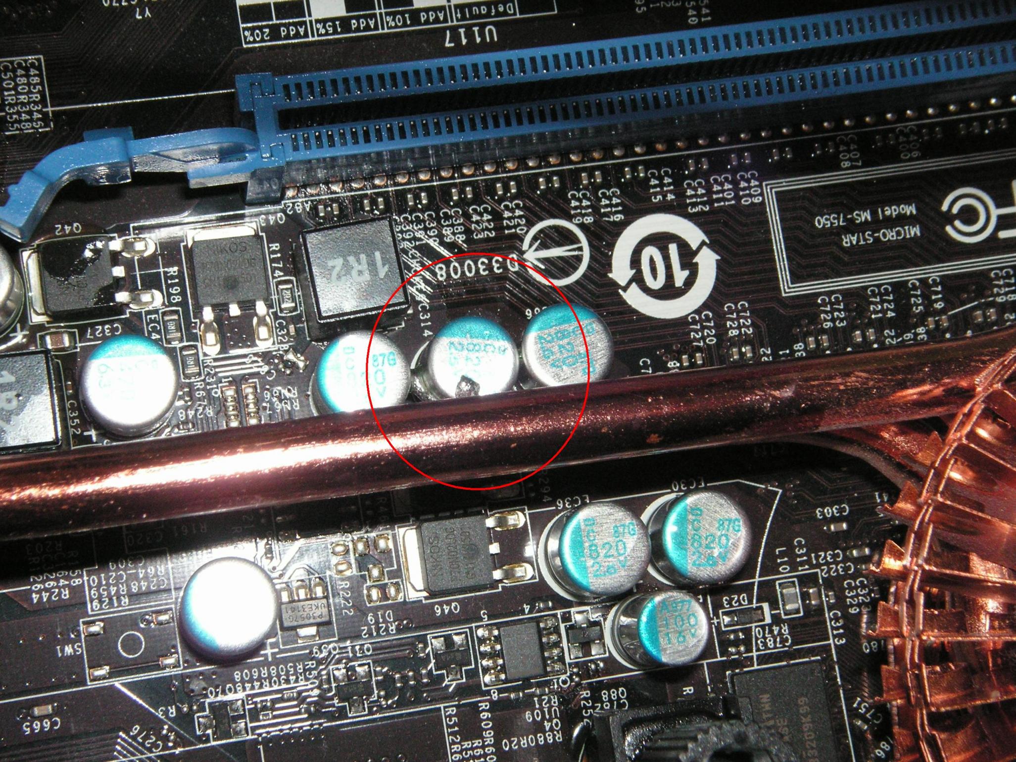 Zuerst dachte ich an die WaKü, es stellte sich aber heraus, dass ein Kondensator auf dem Board geplatzt ist.