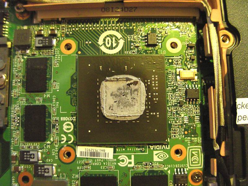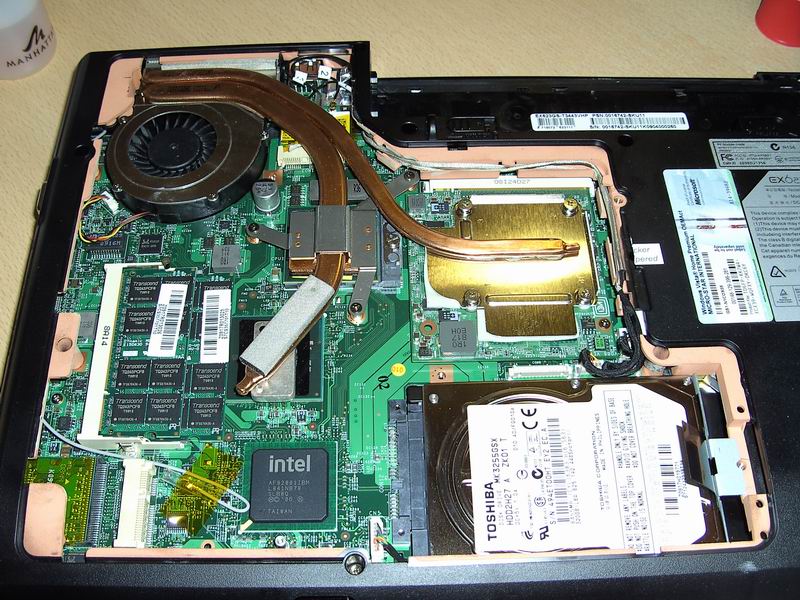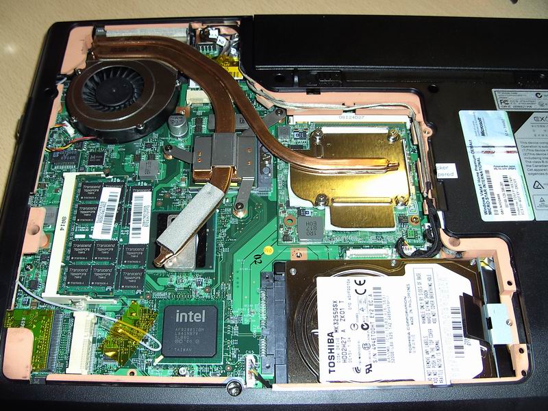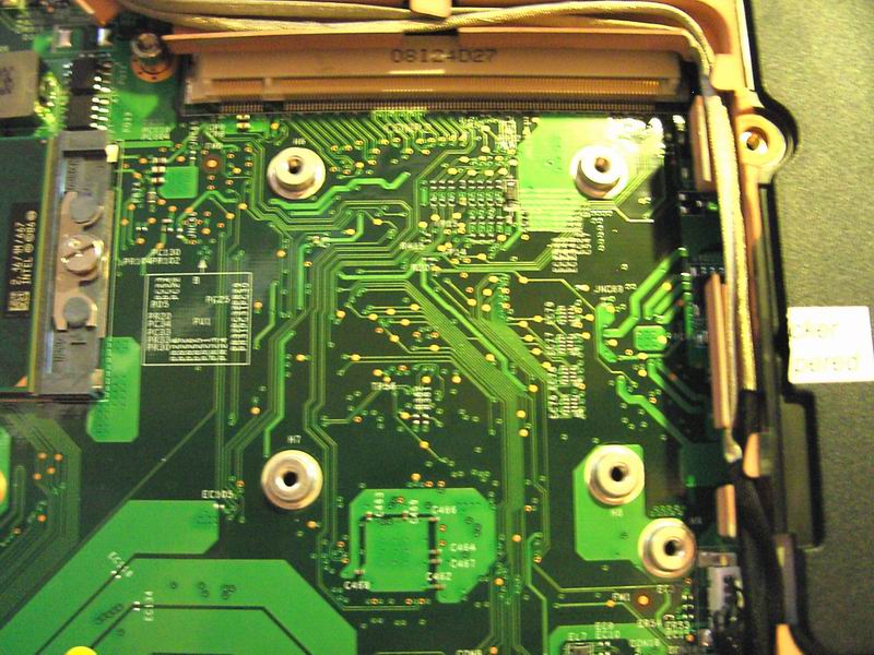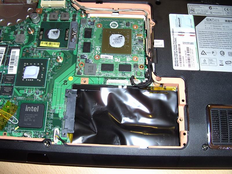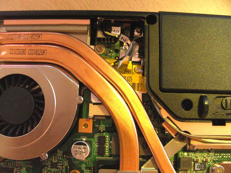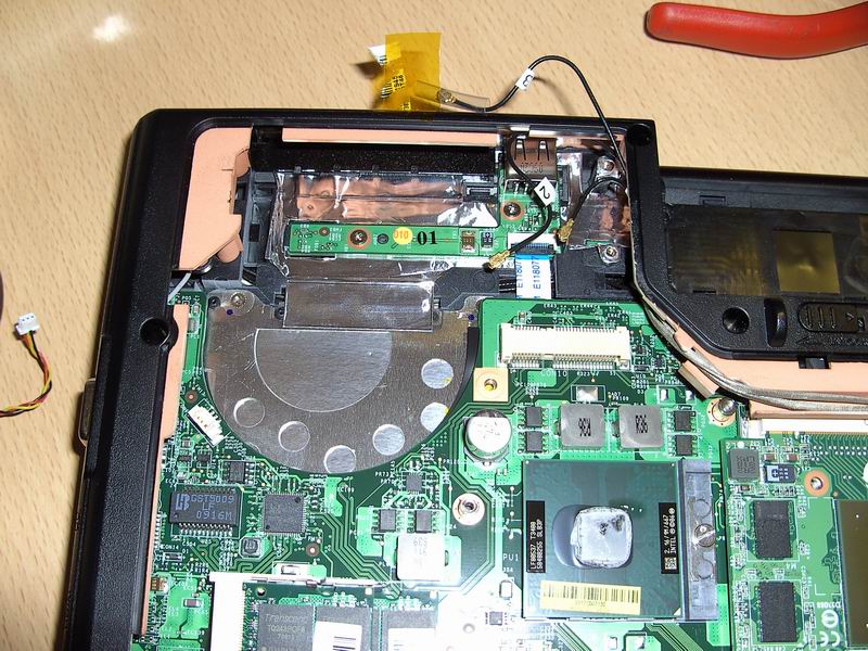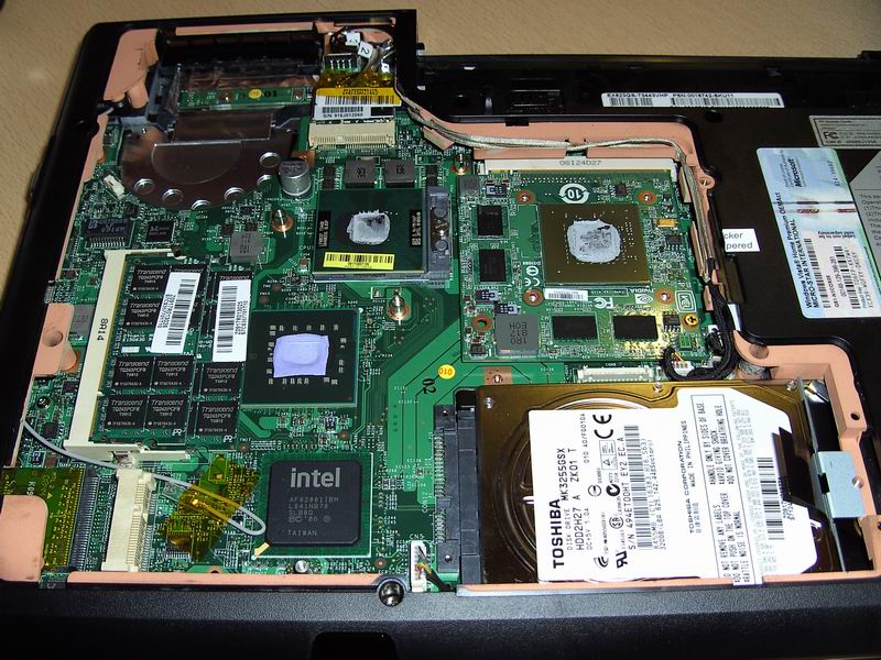 Da ich auf anhieb nichts gesehen hab, hab ich mich ans auseinandernehmen gemacht. Angefangen mit der Grafikkarte (Bild 26), man kann ja nie wissen... Dann sämtliche Schrauben, an die ranzukommen war (Bild 14). Dann hab ich langsam angefangen, das Gehäuse des Notebooks zu entfernen. Das ging nicht so leicht, wie gewünscht.