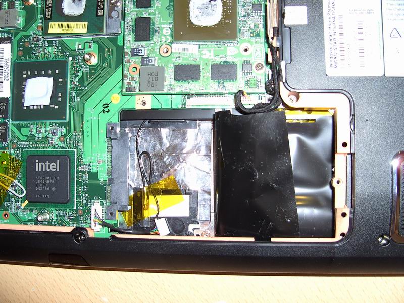 Weil ich nicht einfach nur blöd rumsitzen wollte, hab ich schonmal weiter geschraubt. In der Gegend des Touchpads klemmte es dann ein wenig und ich dachte:" ok, ist vielleicht noch ne Schraube unter der Festplatte". Also bau ich die HDD aus und entdecke eine schwarze Klebefolie (Bild15).