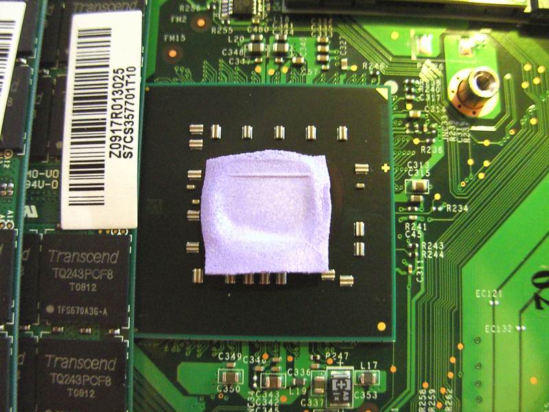 Bild25: Die Northbridge ist, wie schon vom Meister erwähnt, mit einem recht merkwürdigen Wärmeleitpad ausgestattet. Ich war mir allerdings nicht sicher, ob die relativ dünne Wärmeleitpasten-Schicht den nötigen Kontakt herstellen könnte, da sich die letzte Schraube des Kühlsystems bei der CPU befindet. Bei der NB liegt die Kühlung also praktisch nur auf. Allerdings habe ich nach dem Zusammenschrauben gesehen, dass der Kontakt eigentlich reichen müsste, also werde ich die NB auch noch mit der guten ZM-STG1 ausstatten.
