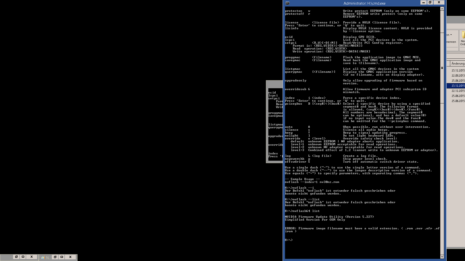 Ich habe versucht, weil ich gedacht habe der Rechner fährt trotzdem noch hoch, mit schwarzen Bildschirm die Karte mit NVflash Version 5.2227 zu flashen (nvflash datei.rom).Ich habe den Maxwell Tweaker 1.36 genutzt! Es ist eine MSI GTX 970 4g die ich im August gekauft hatte