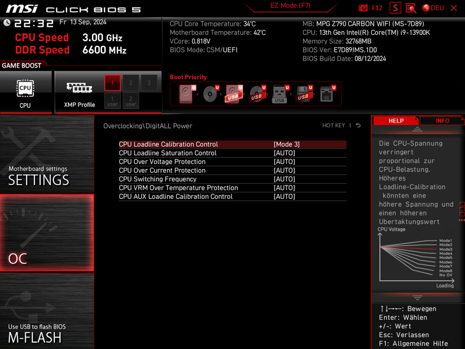 Erweitere dort die Sensoren (auf die <-> Pfeile im Sensoren-Fenster), und dann gucke auf CPU Package Power, CPU-Leistungsaufnahme insgesamt. Stelle CPU Lite Load auf Auto, wenn du einen Referenzwert haben willst, ohne Limits wird da mindestens 130W stehen, bei Prime95-Last vielleicht auch mehr. Dann stell Mode 4 ein und du siehst schon weitaus weniger. Dann kannst du noch niedrigere Modi testen, ob die noch stabil sind.