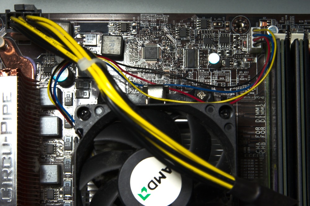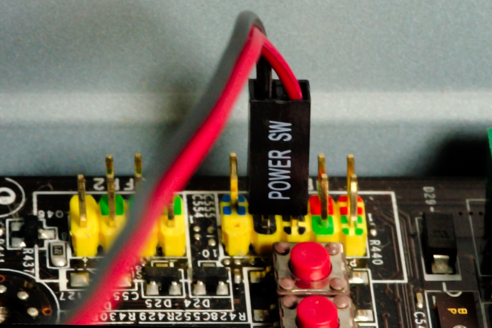 Bei Druck auf den Taster startet der CPU-Lüfter nicht. Die Kontakte zum Taster sind beim letzten Foto abgehoben, damit man besser sieht, wo es angesteckt ist.