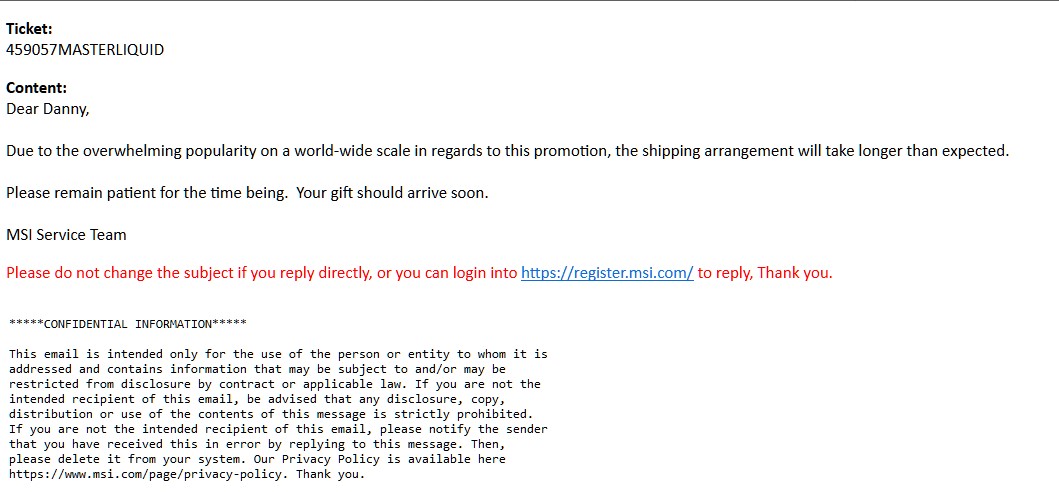 Ich habe mich gestern in einem Anfall von Langeweile, nochmal bei MSI beschwert das es so lange dauert.