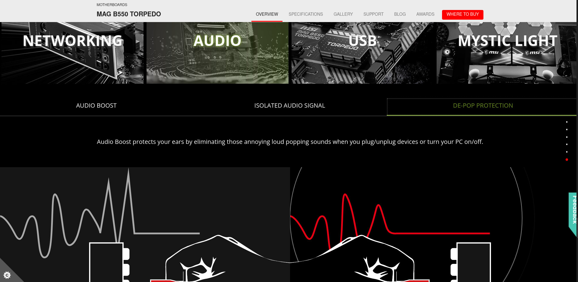 MSI bewirbt das Mainboard auf seiner Homepage damit, dass dank "Audio-Boost" und "De-Pop Protection" dieses Knistern nicht auftreten soll (Bild im Anhang). Mich würde daher interessieren, ob andere Besitzer dieses Mainboards, dasselbe Phänomen beobachten. Falls ja, würde ich davon ausgehen, dass ich das Knistern bisher einfach nur nicht wahrgenommen habe - wobei es mich ab jetzt ganz schön stört. Falls andere das Problem nicht haben, würde ich das Mainboard vielleicht beim Händler reklamieren.
