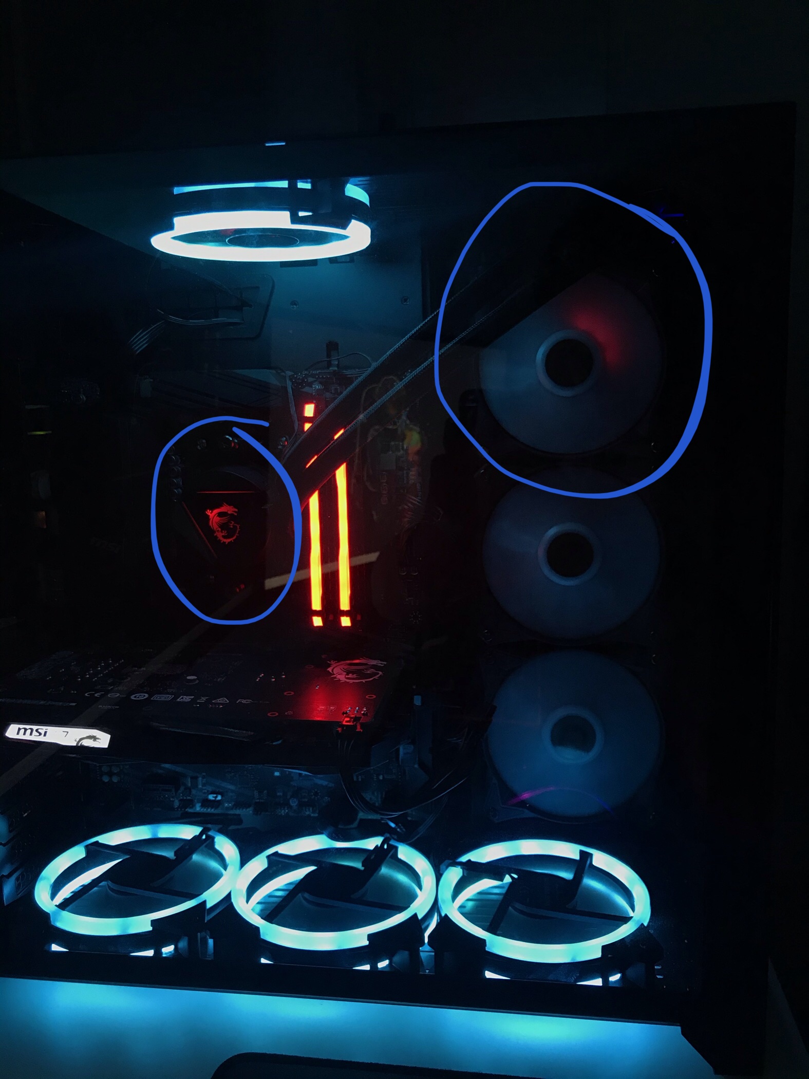 Bzw der oberste von den 3 Lüftern leuchtet nur an einer Stelle rot, der in der Mitte an einer Stelle grün, und der ganz unten garnicht.