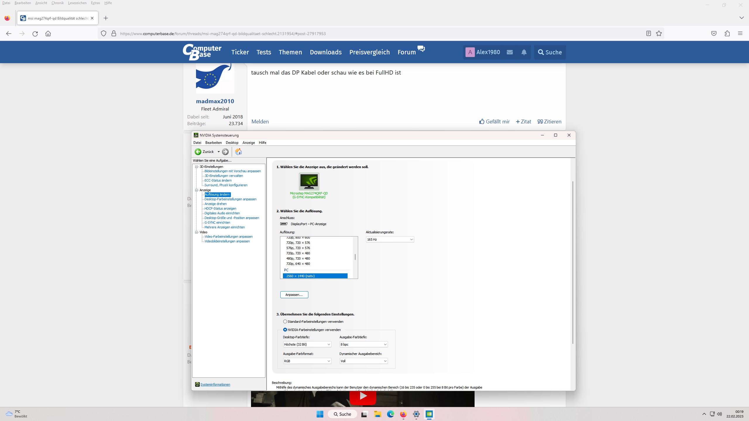 Das nächste Problem ist, dass wenn ich Videos schaue ( z.B. Youtube, Netflix usw. ) dass das Bild qualitativ echt scheisse ist, zum Teil verschwommen. Der Monitor läuft im Windows Betrieb auf 2560X1440 @ 165HZ. Ich achte auch immer drauf, dass ich bei Youtube die höchste Qualiät auswähle ( meistens 1080p oder höher ) Bei Netflix habe ich das Standart HD Abo. Kann versuchen das Problem bei Netflix mit dem Handy aufzunehmen.