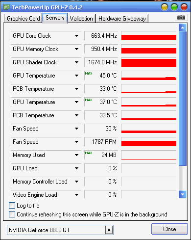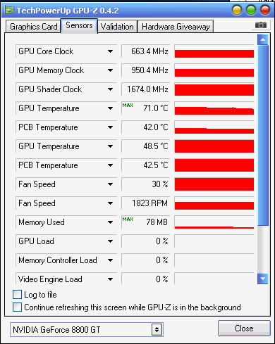 Die Temperatur liegt ungefähr bei 45°C beim spielen. Die Grafikkarte ist seit zwei Jahren im Einsatz, nicht Übertakten und noch alle original Teile dran. Grafiktreiberversion ist 196.21.
