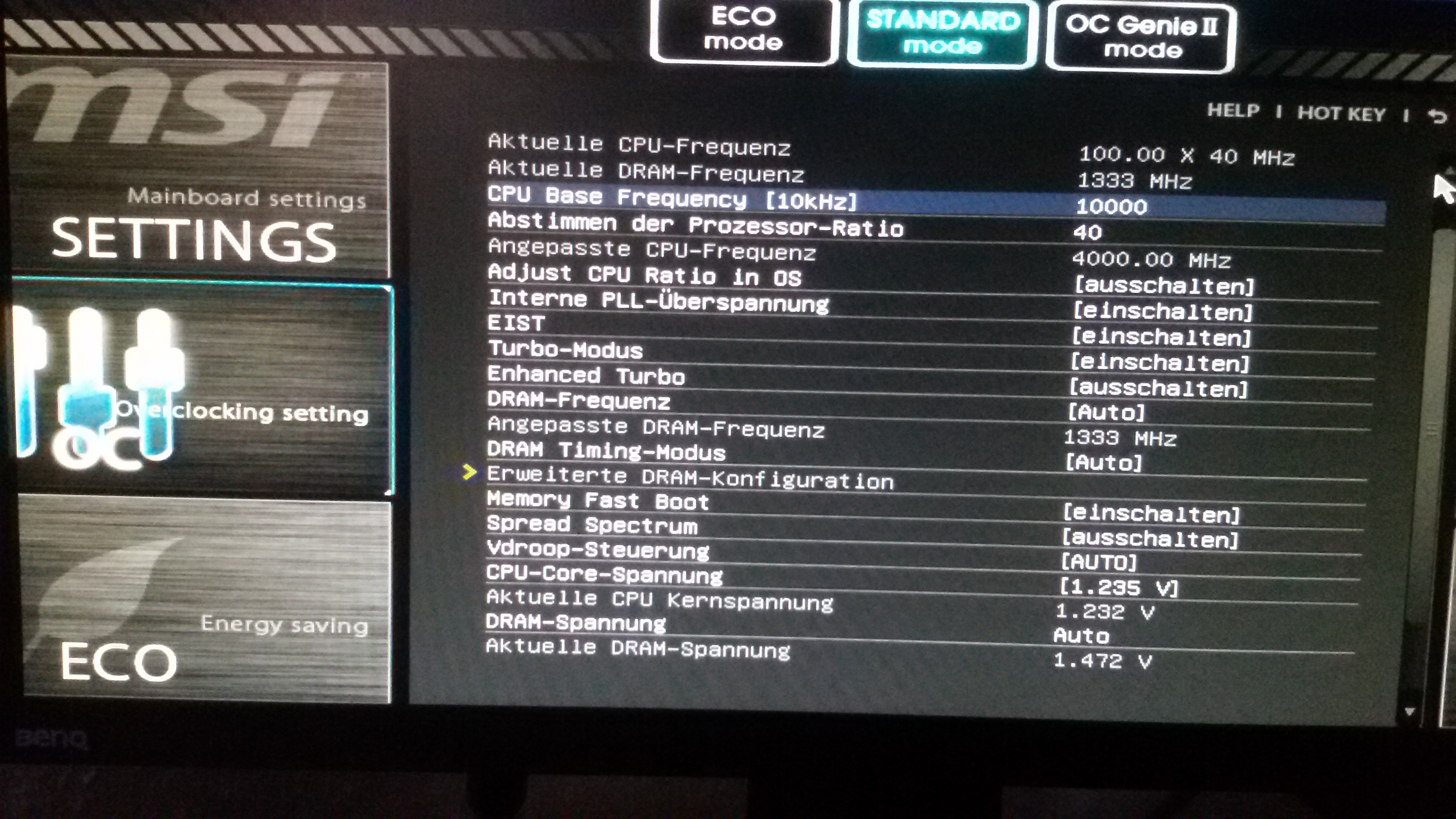 Bei diesem habe ich nun mal den Übertaktungsschutz ausgeschaltet, die CPU Spannung auf 1,215V festgestellt und die CPU Ratio auf 40 erhöht.