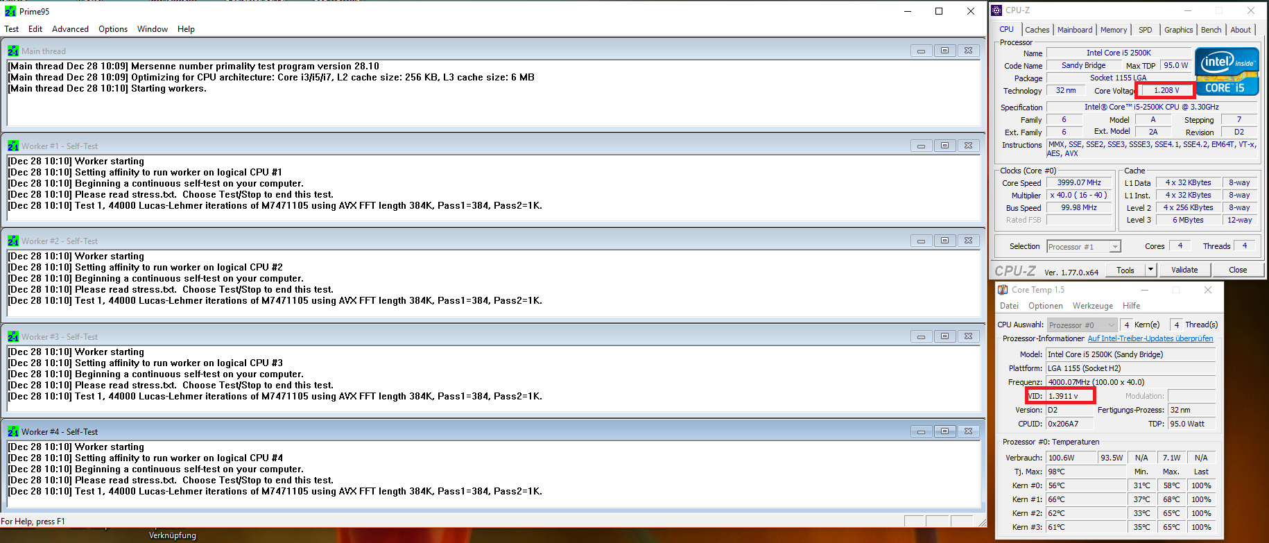 Ich habe dann Preime 95 mit CPU-Z und Core Temp laufen lassen. Anbei der Screenshot nach 10Minuten.