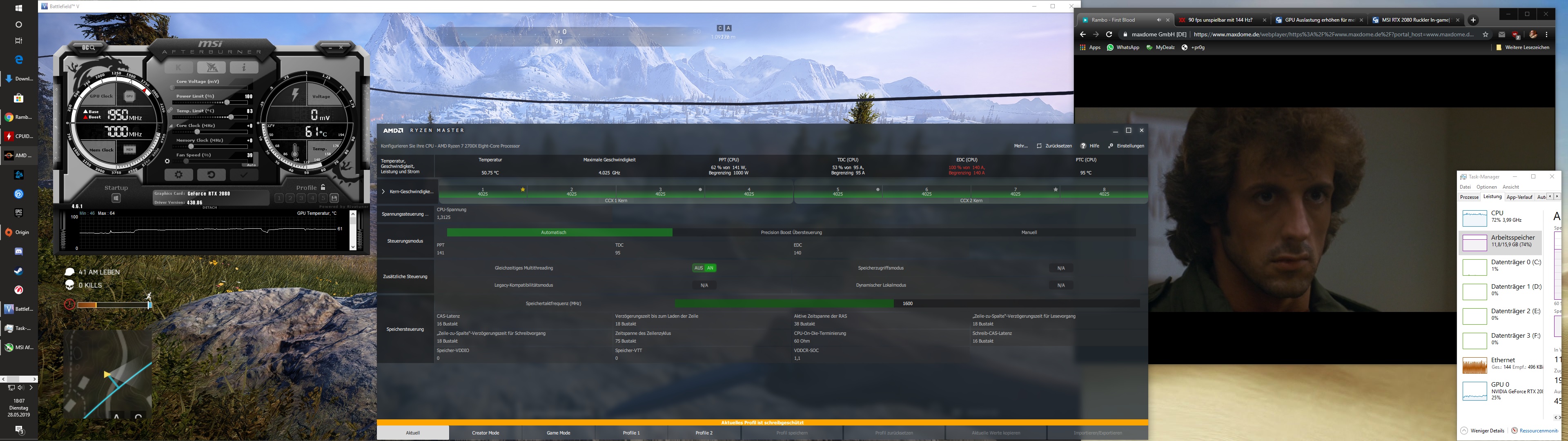 Allerdings ist bei mir in BF V, 120FPS, Höchste Einstellungen, DX12, die GPU bei einer Auslastung von unter 20%!