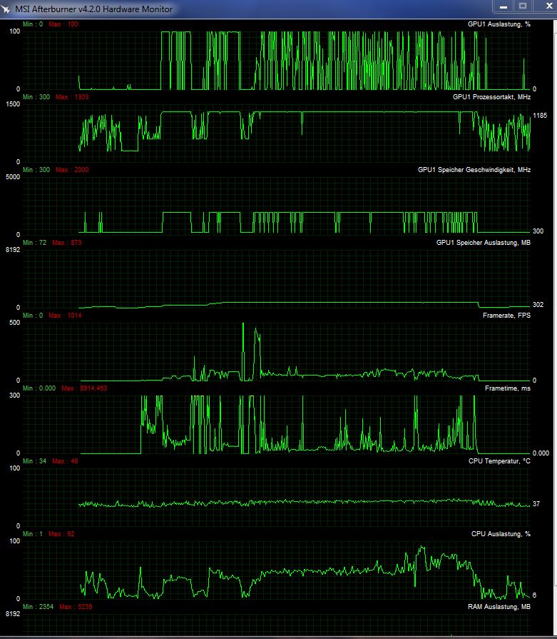 Bei GTA 5 stürzt mein Rechner nach kurzer Zeit ab und das Bild wird grau. Afterburner zeigt mir an, dass sich der Speicher im "kritischen" bereich befindet (~4GB aber die Graka hat 8GB !?).