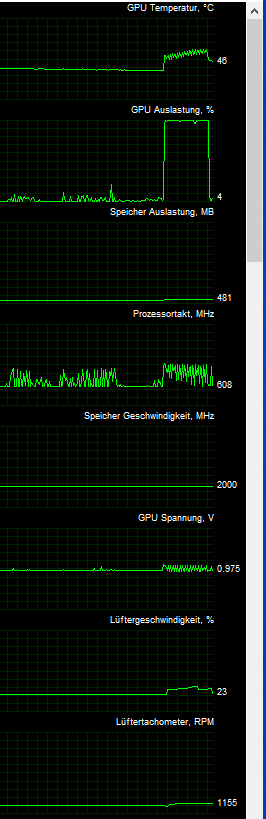 Unter Last (bspw. in Furmark oder in halbwegs anspruchsvollen Spielen) fängt der GPU-Takt extrem an zu schwanken und auch die Temperatur schwankt deswegen mit. Das Bild fängt dann an zu ruckeln, aber nicht wie wenn man wenig FPS hat, sondern es stockt immer kurz in der gleichen Frequenz wie der Takt schwankt. Die FPS selbst sehen dabei gut aus.