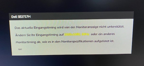 "Das aktuelle Eingangstiming wird von der Monitoranzeige nicht unterstützt. Änderns Sie Ihr Eingangstiming auf 1920x1080, 60 Hz oder ein anderes Monitortiming ab, wie es in den Monitorspezifikationen aufgelistet ist."