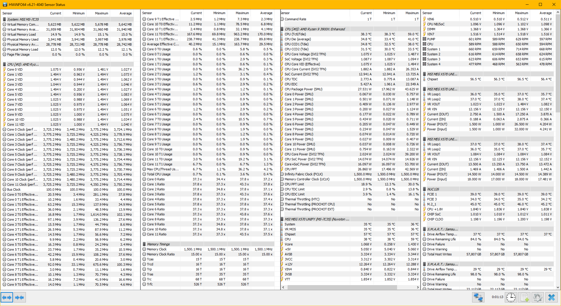 Nach dem Booten habe ich eine CPU Frequenz zwischen 3600 und 4350 mit stetig wechselnder CPU Temperatur. Als mir der Fehler auffiel habe ich etwas herum probiert.