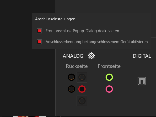 Default ist aktuell mein HDMI-Monitor, bei deaktivierter Anschlusserkennung bleibt der Sound über HDMI. Bei aktivierter Anschlusserkennung schaltet mein Rechner automatisch auf die vorne angeschlossenen Kopfhörer um.