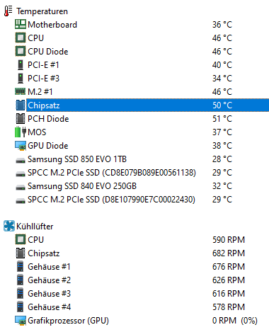 Aida zeigt mir 50 Grad an beim Chipsatz inzwischen unter Windows. Also bringt das langsame Drehen doch noch etwas mehr. In hwinfo sind beide gleich bei mir. Wenn es da bei dir Unterschiede gibt dann merkwürdig.