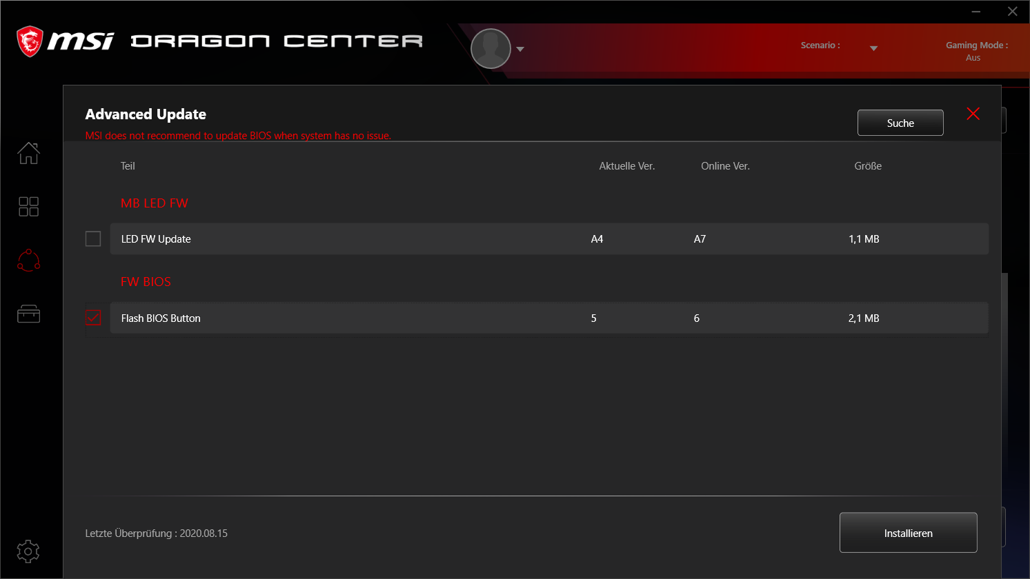 Man kann bei MSI Unify wie bei Asrock ebenfalls die LED Firmware und Flash Button Firmware updaten was ich bis jetzt nicht wusste. Im Overclock Forum teilte das jemand mit und geht mit dem Dragon Center. Die Option ist aber recht gut versteckt. Ich ging davon das bei MSI das ganze im Bios dabei ist, ist es aber nicht. Das ganze findet man im Dragon Center wenn man auf Support klickt und dann auf Fortschritt, dann werden beide Firmware angeboten.