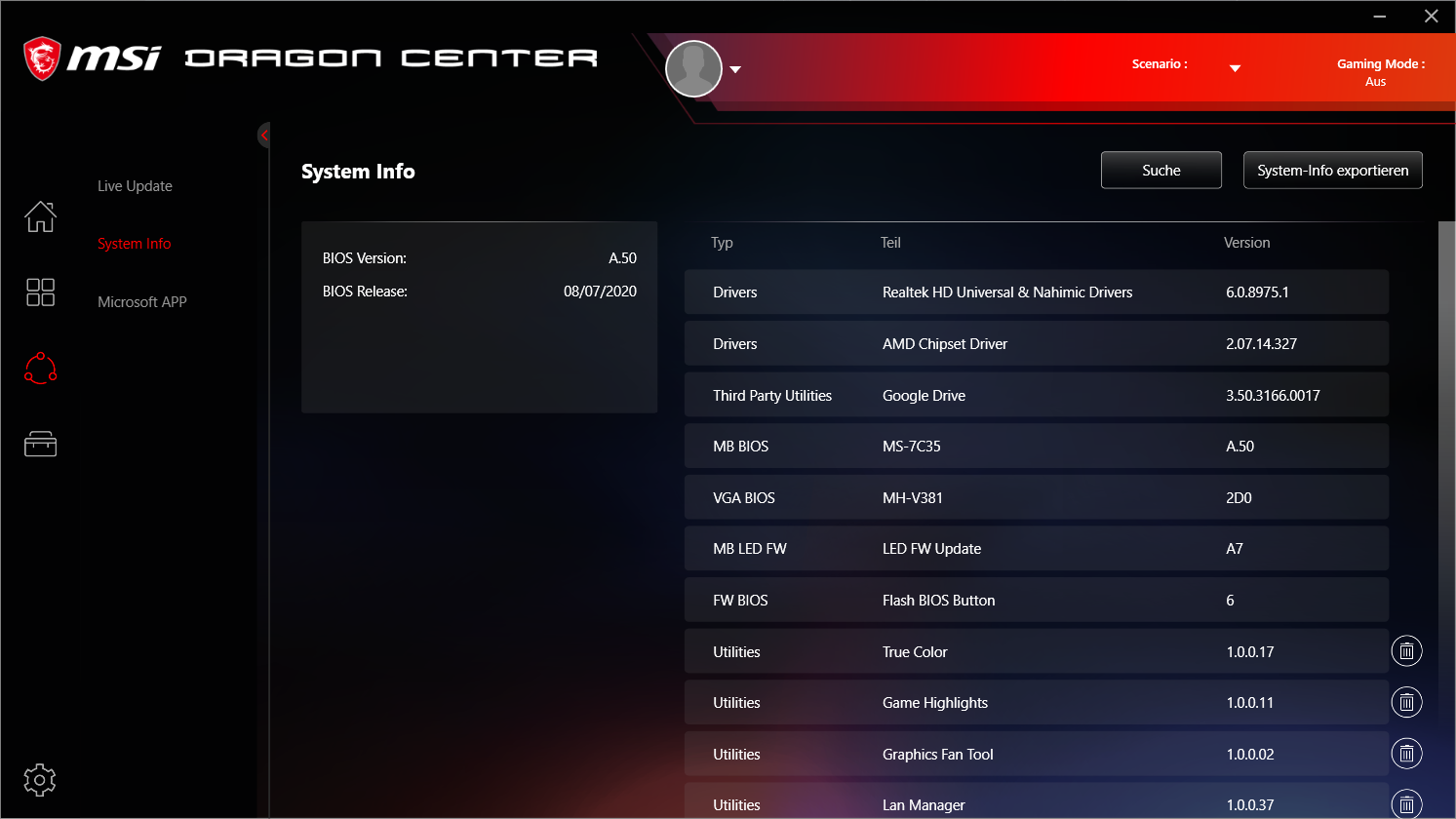 DragonCenter ich hasse son Zeug.... wie auch immer vor 3 Tagen (mal wieder) installiert, dann direkte von A4 auf A5 [wenn schon, denn schon] und im Anschluss LED Firmware und danach Flash Button Firmware.